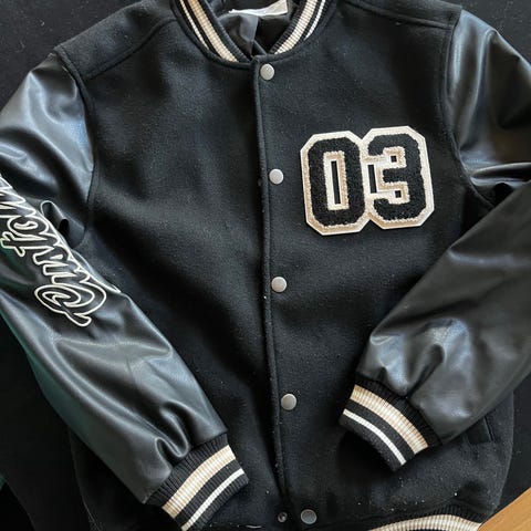 Bomber jakke fra HM. Brukt en gang. Skinn på armene. Str.140. Mørkblå i fargen.