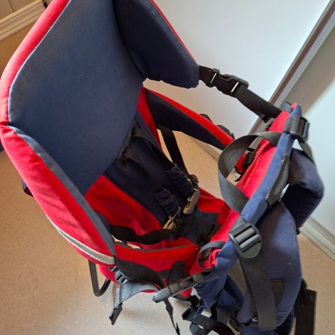 Bergans bæremeis i blå og svart farge. Bæremeisen har polstret rygg og skulderstropper, samt hoftebelte for bedre bærekomfort. Justerbare stropper gjør at både barn og bærer kan tilpasses. Modellen har integrert stativ som gjør at den kan settes stødig fra seg på bakken. Avtakbar lomme/sekk nederst for oppbevaring av utstyr.