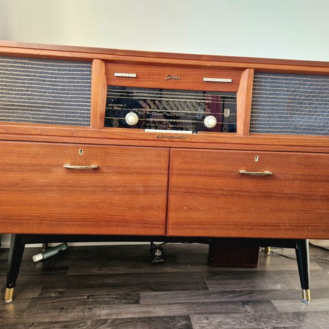 Vintage radiokabinett med innebygd platespiller og ferroceptor-teknologi for radiomottak.