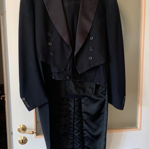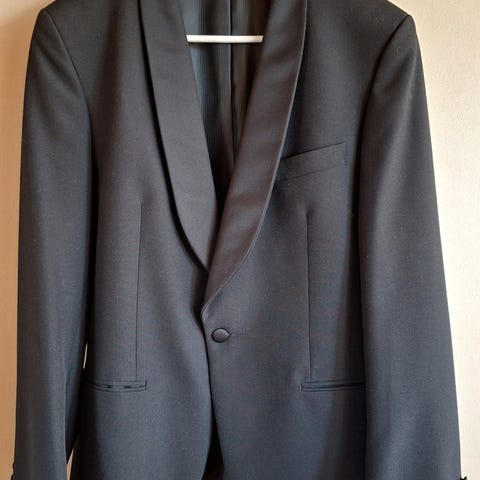 Denne smokingen skiller seg virkelig fra en vanlig dress, Slagene på kragen er laget av silke eller sateng. Fine striper langs buksen gir "smoking looken". Jakken har en knapp og det følger med hvit skjorte (Størrelse 40) med spesielle detaljer som plissert front. Tilbehør som f. eksempel søyfe kan følge med. Stoffet denne smokingen er laget av puster godt og holder fasongen fint. (Smoking brukes til bryllup, prisutdelinger og andre formelle arrangementer).