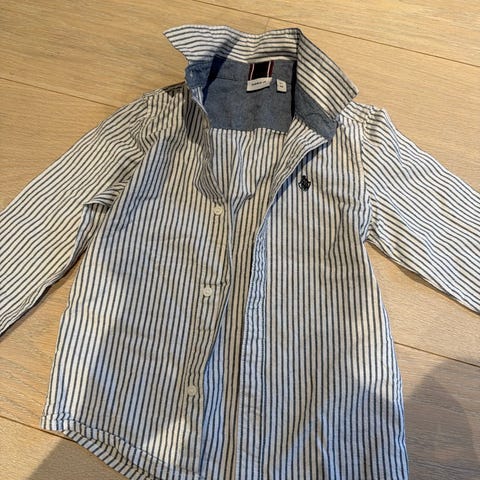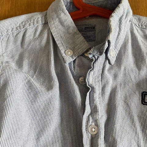 Selger en kjempefin, langermet skjorte fra Name It i fargen "Peach Nectar" (hvit med ferskenfargede striper). Skjorten har et klassisk snitt med brodert emblem på brystet og fungerer like godt til hverdags som til bursdag eller fest.