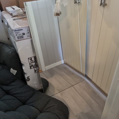 To skap en vask med sigon en kran et speil
