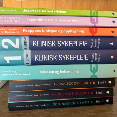 Diverse lærebøker for sykepleier/medisinsk utdanning.