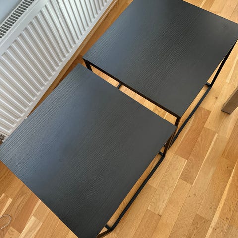 Selger to stilrene sofabord fra Lisboa-serien fra Skeidar. Bordene er helt nye og ubrukte, kun satt opp. De har et moderne og minimalistisk design i svart med solide metallben, og kan brukes sammen som sofabord eller hver for seg som sidebord.