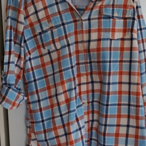 Johns bay skjorte for dame i størrelse L. Skjorten er flerfarget med rutete mønster. Materialet er 100 % bomull. Passer som hverdagsplagg eller til uformelle anledninger. Skjorten har krage og knepping foran.