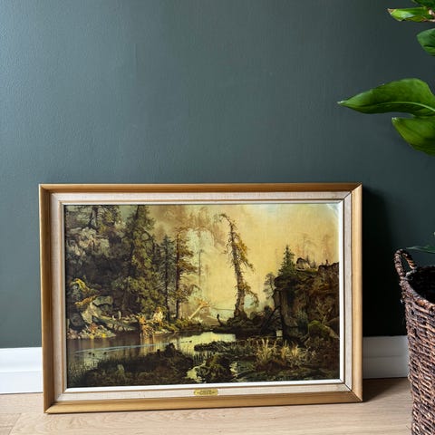 Signert maleri på lerret, motiv fra bjørkeskog med tittel «Lysning». Fin gullramme i god stand. Ca 57 x 67 cm.