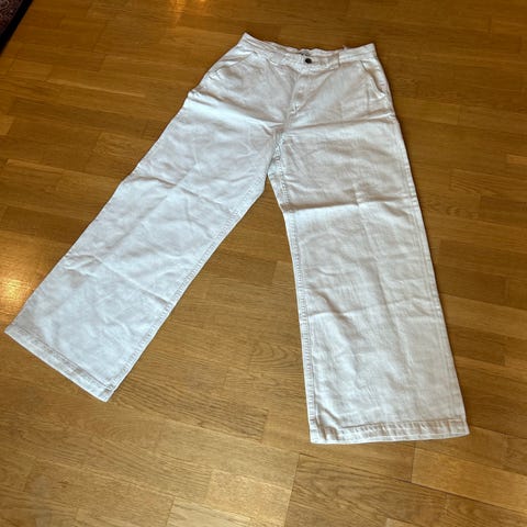 Kul vår/sommerbukse fra Filippa K bukse for dame i størrelse XS. Buksen er hvit og laget i kraftig bomull. Sitter veldig fint på. Modellen har rette ben, knappdetaljer foran. Passer til hverdagsbruk og kan kombineres med ulike topper og jakker for et enkelt og nøytralt uttrykk.