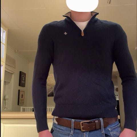 Tynn ullstoff i mørkeblå. Halfzip. Pent brukt. Heller liten i størrelsen enn stor.