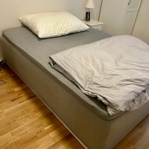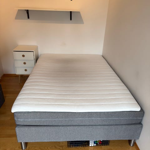 IKEA Engerdal seng 160x200 med Høvåg madrass og Talgje overmadrass grå