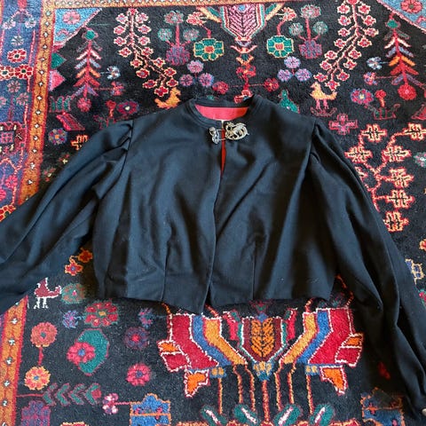 for dame i størrelse S. Jakken er svart og laget i viskose. Modellen er kort med åpen front og korte ermer. Den har brystlomme med dekorativt lommetørkle.