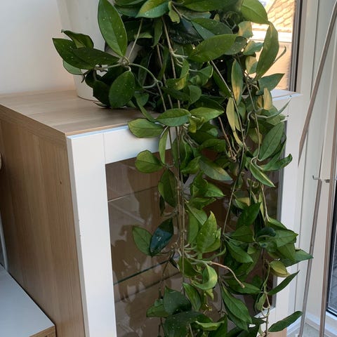 Klatreplante i potte med høyt metallbur som støtte. Planten har grønne, hjerteformede blader og slynger seg rundt stativet. Egner seg som inneplante og kan plasseres på gulv der det er god plass i høyden. Leveres i plastpotte med jord og støttebur som vist på bildene.