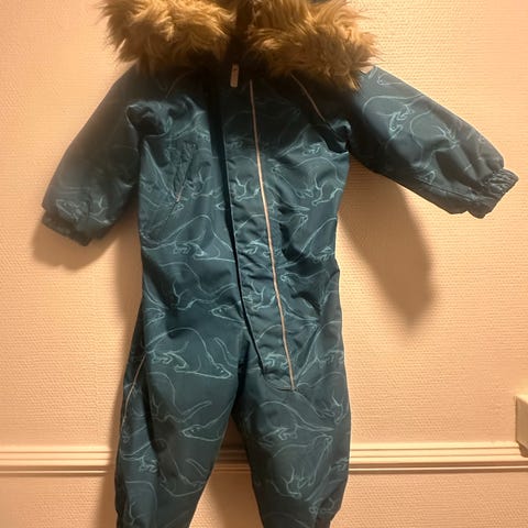 Mørkeblå Reima vinterdress i str 92. Avtagbar hette, strikker under fot, og 2 glidelåser i front- disse fungerer fint. Det har vært små hull 3 steder på bena som vi hsr forsterket med reflekslapper fra Lindex.