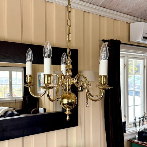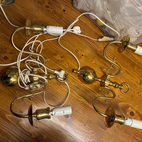 Meget pen messing lysekrone, to lampetter i samme design selges grunnet flytting hvor disse ikke passer inn. Selges helst samlet. Må hentes. De må hentes innen 21.april til ny pris.