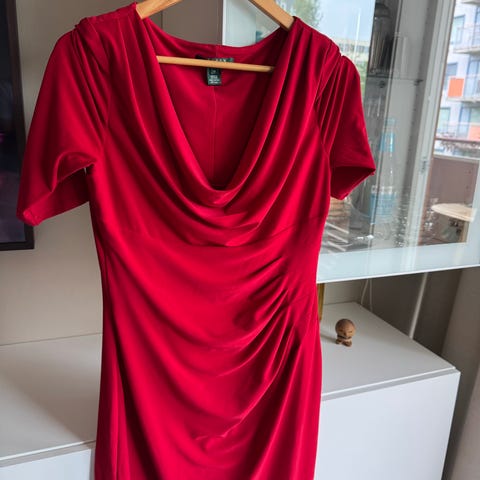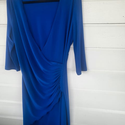 Ralph Lauren festkjole i størrelse 38 som tilsvarer armerikansk 8. Modellen har drapert front med omslagseffekt og trekvartlange ermer. Glatt bakside med enkel fasong. Passer til formelle anledninger og andre situasjoner der en pen kjole ønskes.