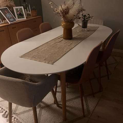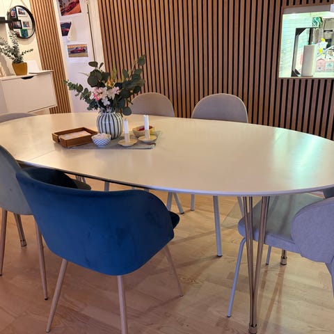 Ett år gammelt Jysk spisebord med stoler i moderne stil. Spisebord med hvit, oval bordplate og ben i lyst treverk. Tilhørende spisestoler med grå polstret sitte- og ryggdel samt ben i lyst treverk. Passer som spisegruppe i kjøkken eller spisestue. Bord og stoler har et nøytralt uttrykk som gjør det enkelt å kombinere med annet interiør. Meget pent brukt, har 8 stoler da to aldri har vært brukt og lagret i tørr bod.
