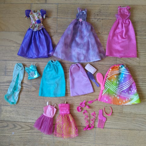 Barbie dukkeklær kjoler flerfarget. Sett med flere kjoler til Barbie-dukker i ulike farger og fasonger, blant annet rosa, hvit, grønn og blå. Kjolene er laget i tynne tekstiler med detaljer som tyll, blonder og mønstrede stoffer. Passer til standard Barbie-dukker i normal størrelse, men ikke originale klær, datteren har brukt de til Barbie og det har fungert okei