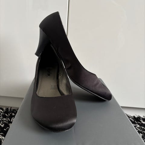 Høyhælte sko i sort velour til dama fra Dinsko. Fine til fest! Er noe lim på innsiden av skoen som har begynt å brune, men sitter fortsatt godt sammen. Disse har stått i en plasteske i over 10 år, men er fortsatt like fine med unntak av det limet! På tide at noen tar de med seg ut igjen.