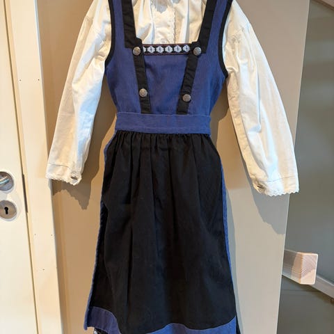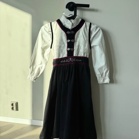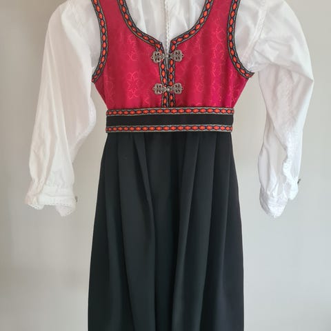 En helt super festdrakt med skjorte til jente i str 116 cm, 6 år. Både drakten og skjorta har fine forseggjorte detaljer. Noen bruksmerker, generelt i god stand. Drakten festes med borrelås på innsiden og en knapp ytterst på beltet, som har fungert for vår del. Det går an å sy på flere knapper hvis man ønsker. En veldig fin drakt!