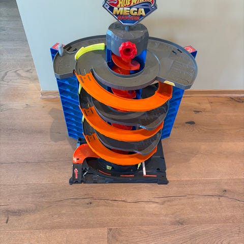 Hot Wheels bilbane med stor loop i oransje og blå plast. Banen består av en rund loop og rette banedeler som monteres sammen på gulv eller bord. Passer til små lekebiler fra Hot Wheels-serien og lignende biler i tilsvarende størrelse.