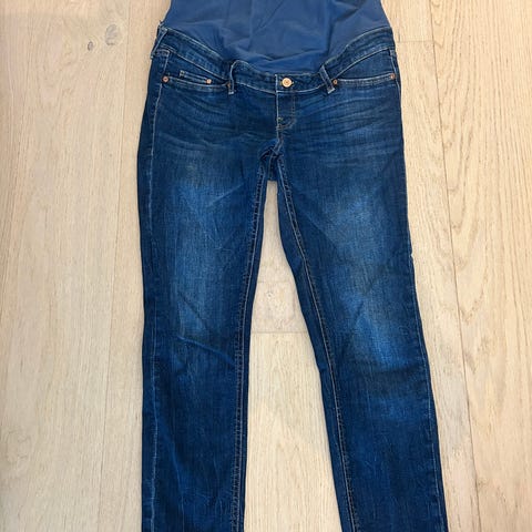 H&M Mama mammabukse i størrelse M for dame. Jeansaktig men I stretchy materiale. Superdigg. Mørkeblå, elastisk magepanel som gir plass til voksende mage. Smal passform i beina. Egnet som hverdagsbukse under graviditet.