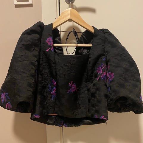 Stoffet er i en slags ullfilt, sort farge og broderier og bånd i lilla.