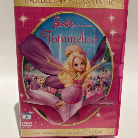 Barbie Tommelise DVD. Animasjonsfilm basert på eventyret om Tommelise, utgitt på DVD med norsk omslag. Filmen følger Barbie i rollen som Tommelise i en moderne tolkning av det klassiske eventyret, med eventyrverden, natur og magiske vesener som sentrale elementer. Egner seg for barn og familievisning. Format: DVD, med plastetui og trykket plateetikett.