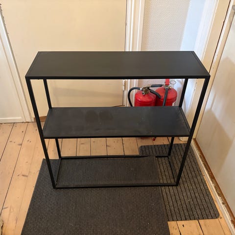 Stødig i metall, brukt som avlastningsbord i gangen.