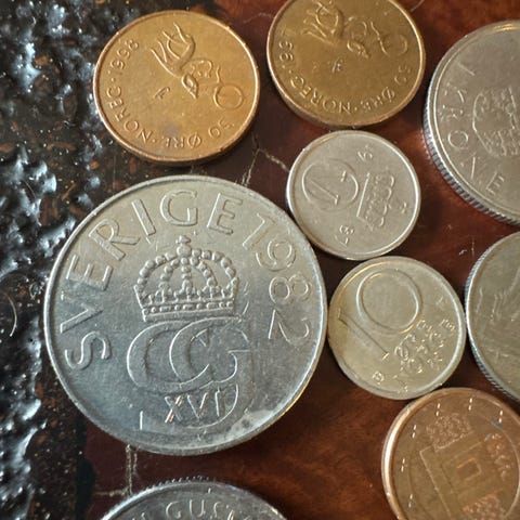 Mynter fra forskjellige land. Pris 45kr. Kan sende