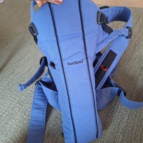 BabyBjörn bæresele i grått stoff. Klassisk modell med polstret frontpanel og justerbare skulderstropper. Egnet til å bære baby tett inntil kroppen. Komfortabel.