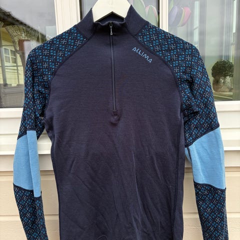 Vikafjell halfzip for dame i størrelse M. Trøyen har høy hals med kort glidelås og lange ermer. Fargen er ulike nyanser av lilla. Plagget er laget i 100% merinoull, egnet som innerste lag til tur og annen utendørs aktivitet.