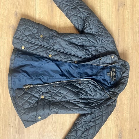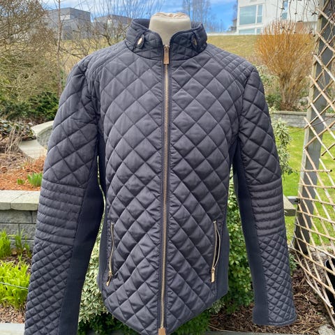 Jakken er blå og har quiltet mønster med lett vattering.