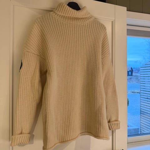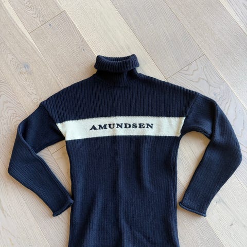 Amundsen ullgenser for herre i størrelse M. Genseren er ribbestrikket i beige ull med høy hals og kontrastfelt over brystet med Amundsen-logo. Materiale: 100 % norsk ull. Farge: beige med mørk kontraststripe. Passer som varm genser til hverdagsbruk og utendørsaktiviteter.