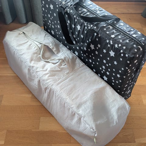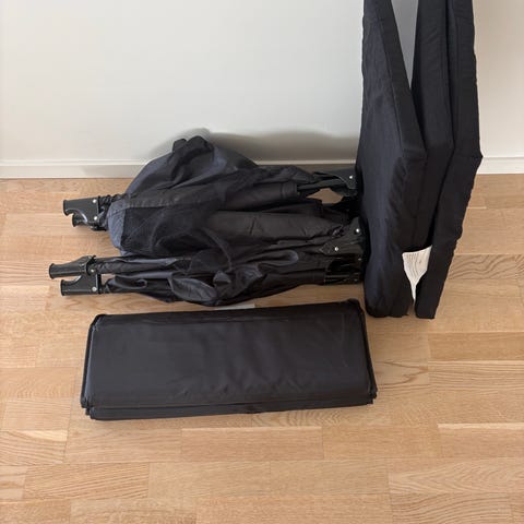 Lite brukt reiseseng med ekstra madrass og laken