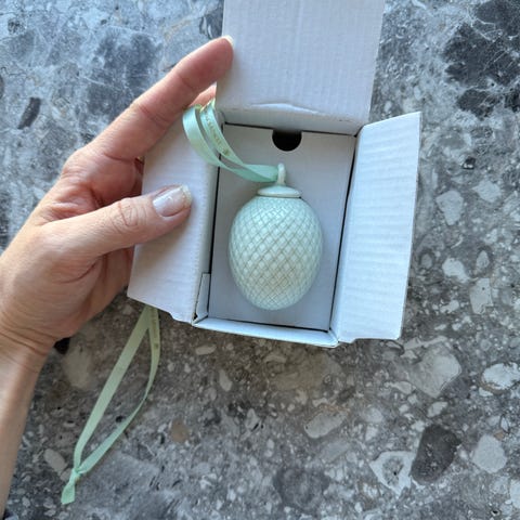 Jette Frølich påskeegg dekorasjon i hvit farge. Esken inneholder 9 små hengende egg med bånd, beregnet som påskepynt. Egner seg til å henge på grener, i vindu eller andre steder der man ønsker sesongdekor til påske.