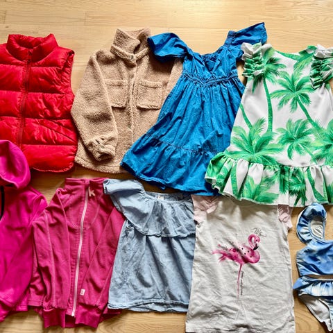 Klespakke til jente str 128. Noen plagg er større størrelse men brukt samme tid. Dongeribukse og rosa bukse er nesten ubrukt, sommersokkene er bare prøvd på da hun ikkje likte lave. 6 tights, 3 bukser, en hettejakke, 5 ubrukte sommersokkepar, 1 bolero, 4 shorts, 1 badedrakt. Kan evt sendes med postnord for 69 kr
