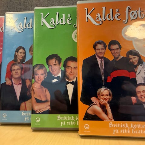 Kalde føtter komplett serie DVD samling. Pakken inneholder flere sesonger av TV-serien «Kalde føtter» utgitt på DVD. Hver sesongboks har omslag med episodeinformasjon, spilletid og aldersgrense på baksiden. Egner seg for avspilling på standard DVD-spiller som støtter regionen angitt på coveret.
