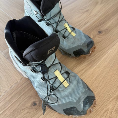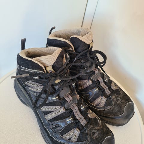 Salomon tursko i størrelse 40 i svart farge. Modellen er en ankelhøy tursko med snøring foran og kraftig yttersåle med grovt mønster for godt grep på variert underlag. Overdelen er i syntetisk materiale og tekstil med forsterkninger på utsatte områder. Skoene passer til tur og friluftsbruk på sti og lett terreng.