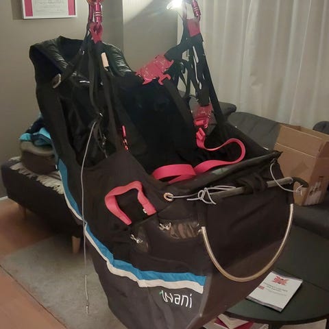 paraglider, paragliding, seletøy, sele, harness, woody valley, woodyvalley, exense, bakketrening, groundhandling, nybegynner, paragliderkurs, elev, kysthang, luftsport, skjermflyging, vinge, trening, treningssele.