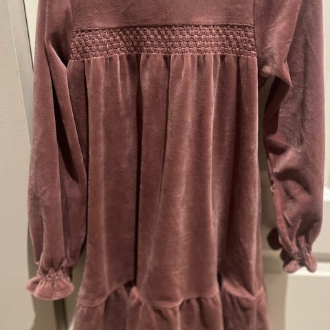 Newbie kjole for jente i størrelse 86. Kjolen er lilla og laget i myk polyester med velurpreg. Den har lange ermer med strikk ved håndleddene, rynket brystparti og volangkant nederst. Lukkes med knapper bak i ryggen. Passer til hverdagsbruk eller mer pyntede anledninger for små barn.
