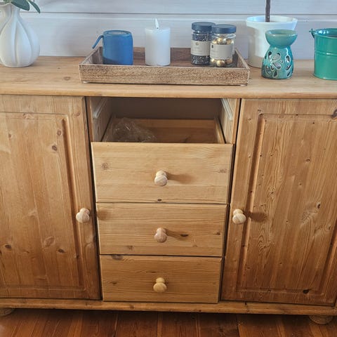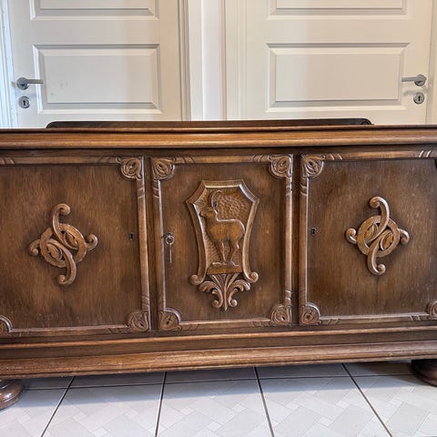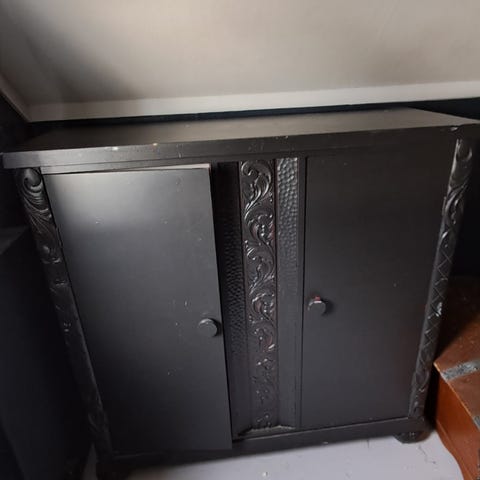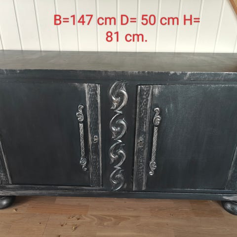 Gedigdne gamle skjenker malt med kalkmaling i mørkegrått med detaljer i sølvfarge. Må hentes.