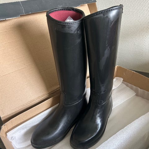 Korte ridestøvler med glidelås foran i svart materiale. Støvlene har forsterket tåparti med dekorative sømmer, hempe bak for enklere påkledning og mønstret yttersåle i gummi for bedre grep. Egnet til ridning og stallbruk.
