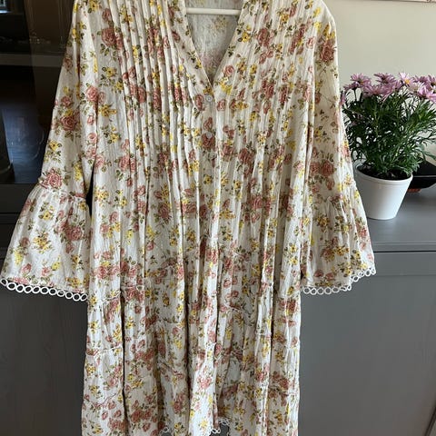 byTiMo sommerkjole i bomull for dame i størrelse S. Kjolen er stor i størrelsen derfor har jeg skrevet at den er i M. Kjolen er flerfarget med blomsterprint på lys bunn. Den har blondedetaljer og hullmønster i overdelen, knapper foran og lange ermer. Skjørtet er lett rynket med volangkant nederst. Materiale: bomull.