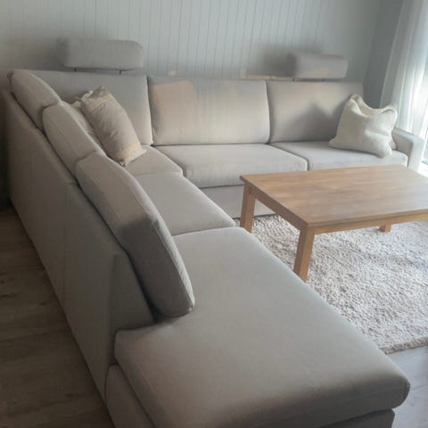 Sofa er delbar og må hentes. Putene og trekk kan taes av og vaskes i maskin
