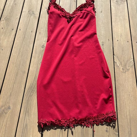 Vero Moda festkjole for dame i størrelse 40. Kjolen er rød og laget i polyester. Den har smale stropper og et blondelignende ytterstoff med blomstermønster og gjennombrutte detaljer. Glidelås i ryggen for lukking. Passer til bruk ved formelle anledninger og festlige sammenkomster.