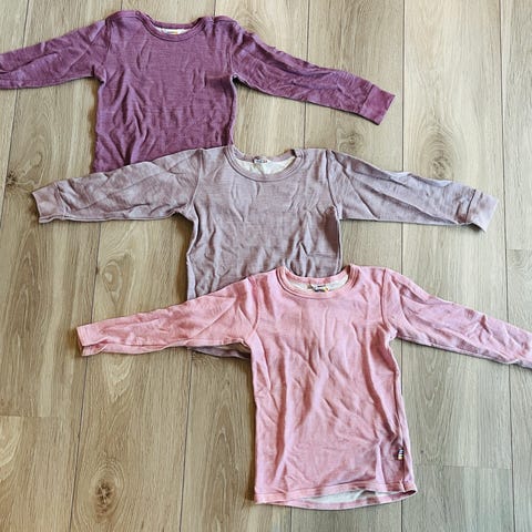 To nye langermede topper i merinoull fra NameIt i hvit og brunrosa. Blonder langs hals, ermer og nedkant. De er ikke brukt, kun tatt av lapp og vasket.