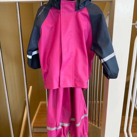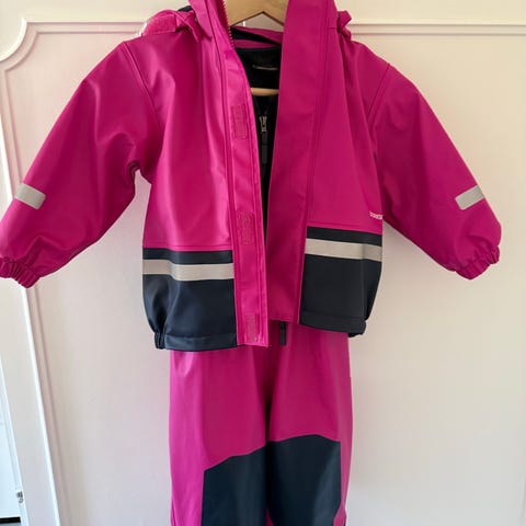 Name it regntøysett størrelse 92. Sett består av regnjakke med hette og regnbukse med seler, fotstrikker intakte. Jakken har elastikk ved håndledd og refleksdetaljer på ermene. Buksen har elastikk nederst ved bena og i ryggen, fotstrikker og refleksdetaljer. Romslig og god i størrelsen og buksa kan justeres godt.