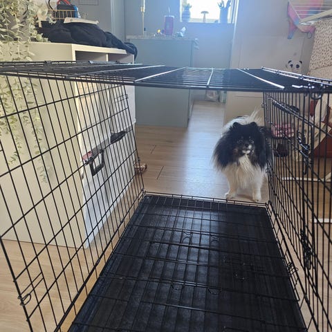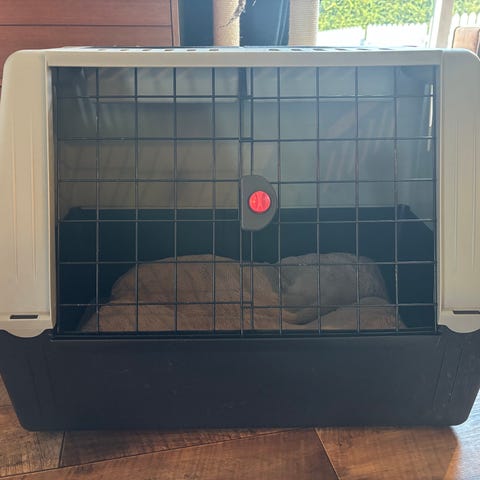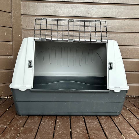 Hundebur i plast og metall i mellomstor størrelse, i fargene grå og svart. Veldig praktisk ved skrå sider i bagasjerommet. ventilasjonsåpninger på sidene og metallgitter i front. Døren i metallgitter gir god lufting og oversikt for hunden. Egnet til transport eller som fast liggeplass for små/mellomstore hunder, avhengig av mål og hundens størrelse. Buret har bærehåndtak på toppen for enklere håndtering og kan plasseres i bil eller innendørs etter behov.