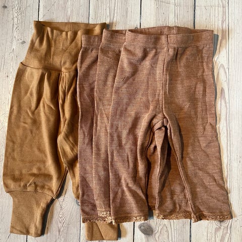 Name it babybukser i brun farge, størrelse 50 Buksene er laget av 100 % merinoull, som fremgår av vaskelappen.