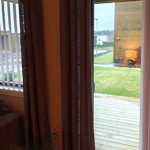 Pent brukt, kun hengt på soverom. 6 lengder 220 cm. Gull/varm oker farge