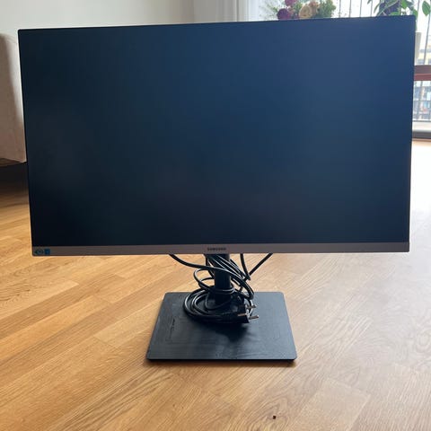 Samsung 246E7QDSW skjerm med 24 tommers skjermstørrelse. Skjermen har HDMI-inngang og USB-tilkobling, som vist på baksiden. Egnet til bruk med PC eller andre enheter som støtter HDMI. Foten er integrert i skjermen, og strøm- og signalkabler kobles til på baksiden. Passer til vanlig kontorbruk, enkel bilde- og videovisning eller som ekstra skjerm.